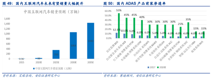 2017年以来,国家层面关于汽车电子顶层设计政策密集出台,对车联网产业、智能汽车产业提出了行动计划或发展战略,其中2018年年底出台的《车联网(智能网联汽车)产业发展行动计划》明确指出到2020年车联网用户渗透率达到30%以上,新车驾驶辅助系统(L2)搭载率达到30%以上,联网车载信息服务终端的新车装配率达到60%以上的应用服务层面的行动目标。