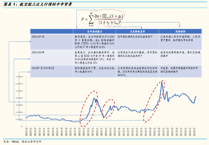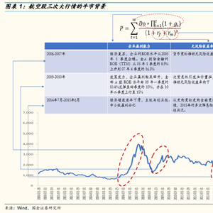 我们在《航空深度—三重周期叠加,基本面迎来向上拐点》中提出,航空公司业绩是供需、油价、汇率三重周期叠加的结果。供需增速的相对变化,产生航空收益水平的波动;油价和汇率对于航空业费用端,甚至经营策略产生影响,对于航空公司业绩造成扰动,最终产生航空行业以及净利润的周期性。作为续篇,在本篇报告中,我们对2000年以后我国航空股的三轮周期进行复盘,尝试挖掘航空股牛市的驱动因子,分析其取得超额收益的条件。我们以DDM模型入手,将企业盈利(D)、无风险收益率(Rf)和风险溢价率(Rm)作为影响股市的三大因子。