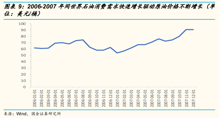 油价:全球原油需求旺盛,驱动油价持续上涨。2003年以来,全球经济进入新一轮的扩张。IMF数据显示,2004-2008年全球经济年均增幅为5.1%(其中新兴经济体年均增幅为7.8%),比1998-2002年高近2个百分点。与此同时,世界石油消费需求快速增长(2003-2008年世界石油消费量增长了8%,比前5年提高了3个百分点),导致国际原油价格开始了不断上涨的进程。