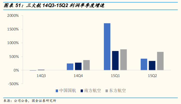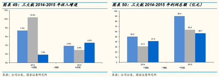 净利润:三大航2014-2015年间合计利润总额为332.9亿元,主要受益于油价大跌带来的成本压力骤减,其中15Q1利润同比涨幅在7倍以上。