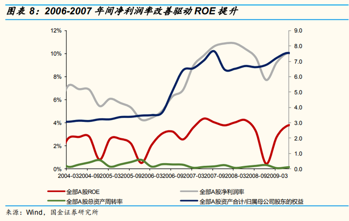 收入的改善和经营效率的抬升是这个阶段盈利抬升的关键。拆分ROE的驱动因素,我们发现06年前杠杆率抬升助推ROE抬升,06年后净利润率的改善发挥了更大的作用,净利润率从06年2季度的5.06%上升到07年4季度的10.88%。
