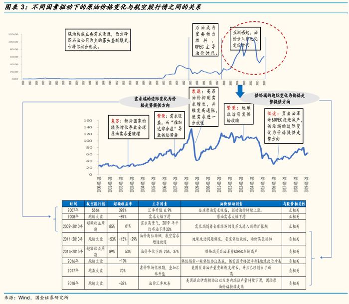 (2)原油供给端的边际变化驱动的油价上涨/下跌,在需求增速平稳的背景下,等同于航空产业链上下游的议价能力间的博弈。