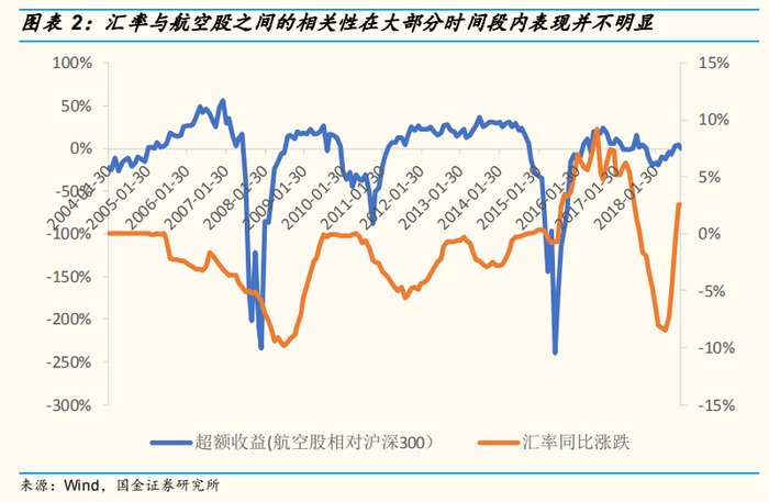 汇率与航空股之间的相关性,在大部分时间段内并不明显,而在出现巨幅波动时(2005-2007年、2018年),往往带动航空股超额收益/损失。