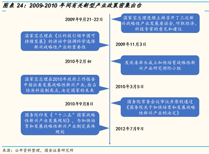 2009年9月开始,温家宝总理主持召开三次战略新兴产业发展座谈会,展开对节能环保、信息技术、生物产业、新能源、新能源汽车、高端装备 制造、新材料等新兴产业的讨论。