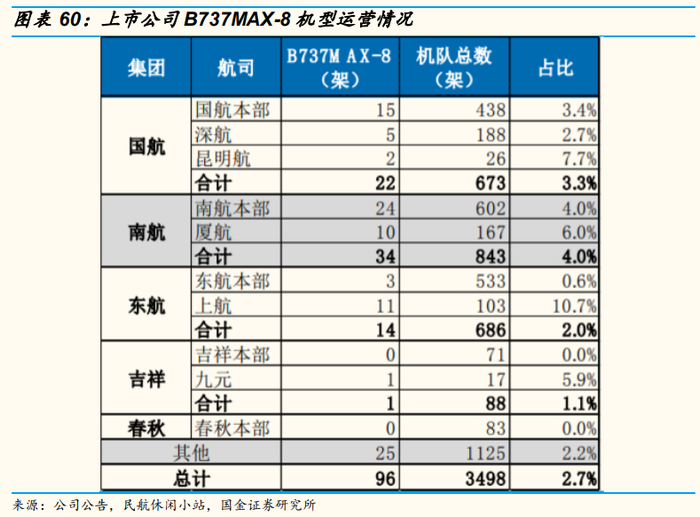 以三大航为例,根据三大航年报,国航、南航、东航2019年将引进B737飞机31架、45架、26架,2019年前两个月引进的8架B737飞机中有5架是MAX机型。若按此比例,国航、南航、东航2019年将引进B737MAX-8飞机19架、28架、16架,共计63架,约占2019年三大航飞机引进架数的30%。