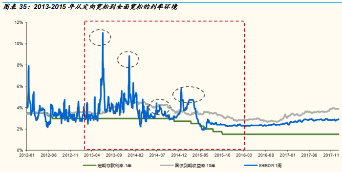 从定向宽松走向全面宽松的利率环境。2013年-2015年,我国经济增速逐年下滑。2013年,金融市场经历620钱荒。2015年,面对国内经济增速放缓,物价涨幅回落,外汇占款变化以及美联储加息预期等不确定性因素有所增多的情况,央行采取多种货币政策工具调节市场流动性并引导利率下行,全年央行共降息5次。