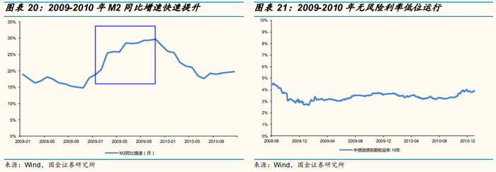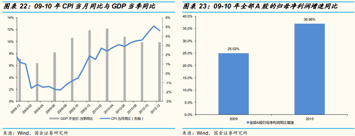 流动性的持续宽松,使得无风险利率低位运行,叠加货币及财政政策的强力刺激,使得宏观经济和企业盈利的预期向好。09年二季度开始,宏观经济触底回升。GDP单季同比由09年一季度的6.6%反弹至09年四季度的12.2%,已接近危机前的增长水平。在宏观需求带动下,微观企业盈利同样快速企稳,微观盈利修复成为本轮牛市行情的又一强力支撑。