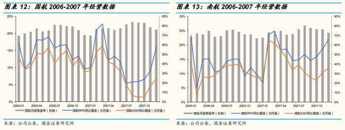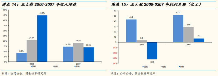 收入:2006-2007年间,国航/南航/东航收入年均涨幅分别为14%/20%/29%,向上趋势主要由RPK主导,单位客公里收益决定波动幅度。
