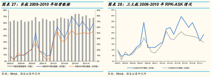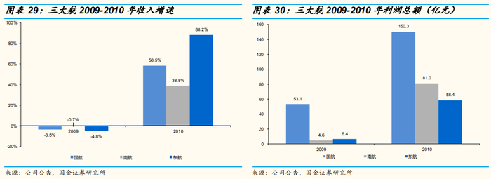 收入:2009-2010年间,国航/南航/东航收入年均涨幅分别为24%/17%/34%,向上趋势主要由RPK主导,单位客公里收益决定波动幅度。