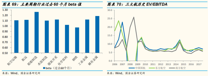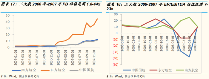 航空估值指标:航空股2006-2007年间PB估值范围1.8-44x,估值中枢21x,EV/EBITDA估值范围7-23x,估值中枢16x。