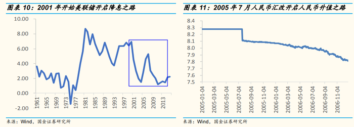 汇率:重启汇改,人民币汇率大幅升值20%。伴随世界经济新一轮扩张的,是美联储宽松的货币政策。2001年1月开始,美联储在一年内先后11次降低短期利率,从6.5%降至4.5%,并且在2002年11月和2003年6月又降了0.75%。