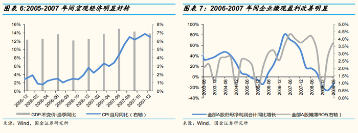 2005-2007年之间,GDP同比从2004年4季度的8.9%上升至2007年2季度的15%。宏观经济的好转反应到企业的盈利改善上,企业的ROE水平从2005年1季度企稳。全部A股的ROE(TTM)从05年1季度的2.4%上升到07年4季度的4.7%。