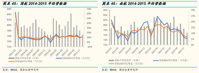 期间,三大航客座率趋于平稳,2015年上半年,国航/南航/东航分别0.7%/+0.7%/+0.5%。