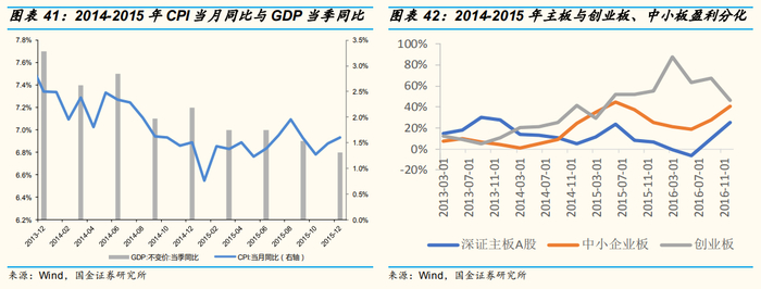主板与创业板、中小板盈利分化。2013年以后,由于宏观经济增速下行给企业盈利带来的巨大压力,各口径的盈利增速大多处于下行的趋势,但由于大量的并购并表,中小板和创业板的利润增速一直处于上行趋势,主板与创业板净利润增速出现分化。
