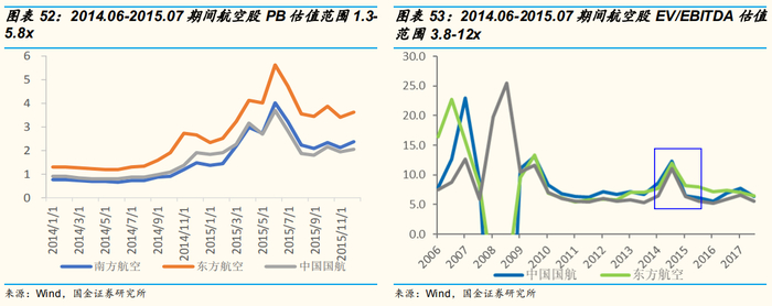 估值指标:航空股2014年7月至2015年6月年间PB估值范围1.3-5.8x,估值中枢3x,EV/EBITDA估值范围3.8-12x,估值中枢7.4x。