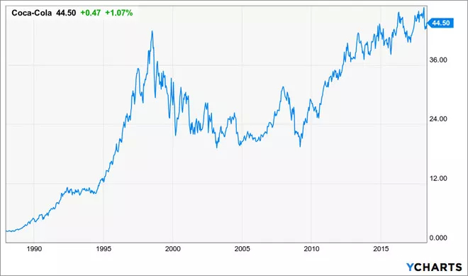 巴菲特建仓之后,整个腾飞的九十年代,可口可乐估值与盈利双击,十年内股价涨了近18倍。