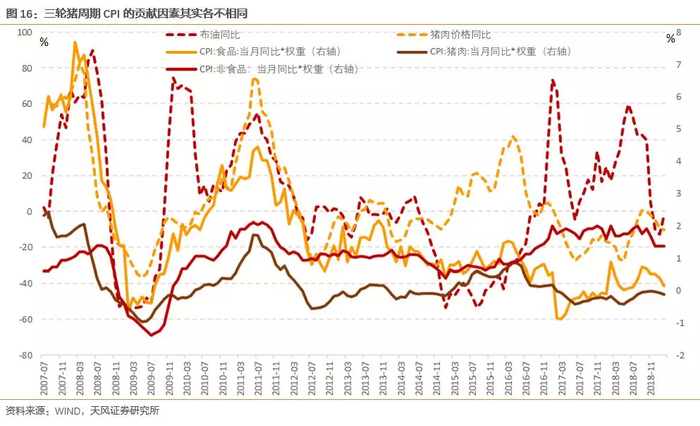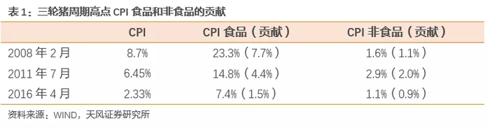 2016年之前,食品权重在1/3左右,非食品权重在2/3左右;2016年之后,食品权重下降至20%(主要是原食品项中的“茶及饮料”和“在外用膳食品”项划至非食品),猪肉权重在2016年之前计为3%,2016年后2.5%左右。我们考虑权重计算分项贡献。