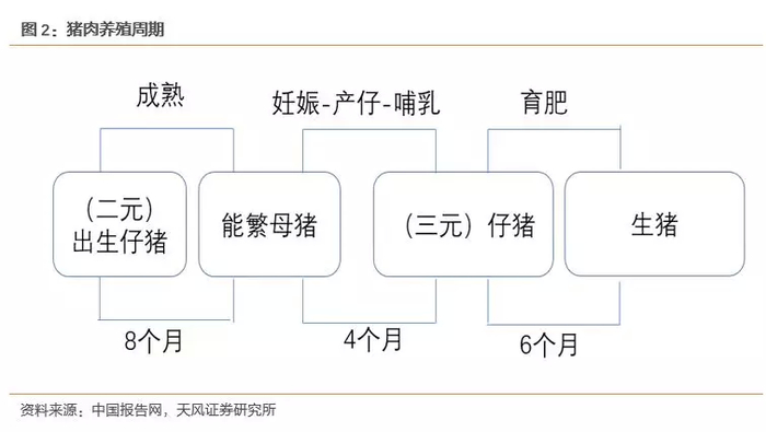 猪肉价格周期是由养殖周期决定的,由于二元仔猪-能繁母猪-三元仔猪-生猪之间的养殖周期长度约为1.5年,养殖户由于猪价变化导致亏损或盈利,进而调整猪肉生产,最终导致猪肉产能释放的时滞也在1.5年左右。我国规模化养殖程度较低,散户更容易因价格的变化改变生产决策,加剧了猪肉价格的波动。