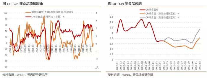 原油和其他大宗商品贡献了CPI非食品项的主要波动。如果用油价模拟,在高基数效应下今年CPI非食品中枢下行。单纯看基数,年末可能会有CPI非食品项的上行压力。
