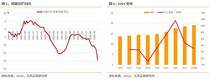 对于猪肉生产,产能就是母猪存栏×MSY(生产效率,每年每头母猪出栏肥猪头数)。因而还要考虑产能的提高:近年MSY持续上升,但即使考虑10%的MSY增速,总产能下降也接近19%(0.8*1.1)。MSY的提升是个慢变量,不改供给收缩趋势。