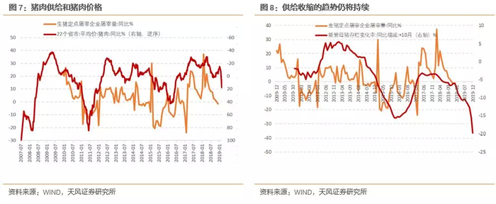 2017年年末开始母猪存栏已经开始下降,2018年10月受非洲猪瘟影响,存栏下降速度明显加快。由于母猪存栏-生猪出栏的周期是10个月,当期母猪存栏决定10个月后猪肉供给,到2019年底为止,供给收缩的趋势不会变。