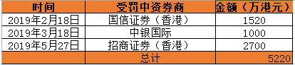 据不完全统计,香港证监会自2019年开年以来,已经对3家中资券商开出了总计5220万港元的罚单。