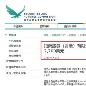 27日,香港证监会对招商证券(香港)有限公司作出谴责,并处以罚款2,700万港元。