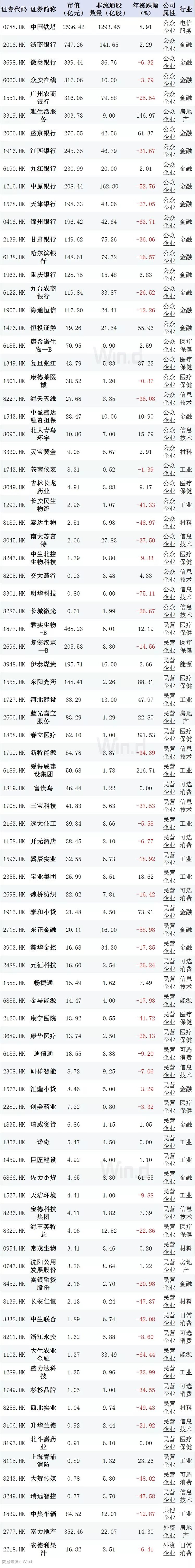 Wind数据统计显示,截至目前,在港上市的H股公司共有280家,其中有162家显示存在非流通股。剔除国企后,另有87家私营企业、公众企业、外资企业及其他企业。
