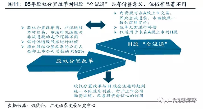 由于同样是为巨量非流通股引入市场化定价机制,H股“全流通”自试点之日起,常被投资者拿来与05年A股的股权分置改革进行类比。两者的相同点在于:本质上都是“盘活存量”,为非流通股引入市场化定价机制,降低大股东和中小股东的“信息不对称性”和“利益不一致性”,改善公司治理、企业管理和经营能力,并为后续资本运作打开空间,长期均有利于资本市场发展。