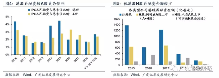 港股公司再融资启动程序简单,审批条件宽松,能更高效地获得再融资资金。但对比2015年以来再融资规模,尽管公司数量差异不大(图2、3),H股公司再融资规模大幅小于红筹股,表明H股“融资难”的问题客观存在。