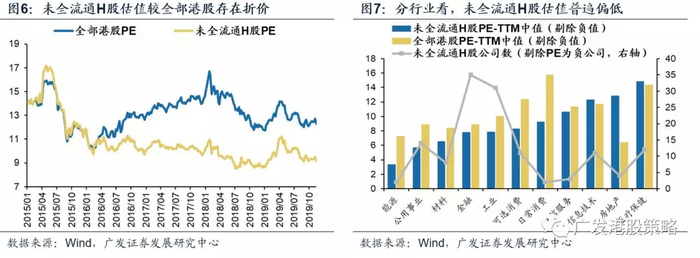 近年来H股(未在A股上市的H股,剔除A+H股)整体估值较全部港股存在明显折价,从行业层面看,除地产行业H股估值显著高于全部港股外,其余行业H股估值均低于或持平于全部港股(图7)。