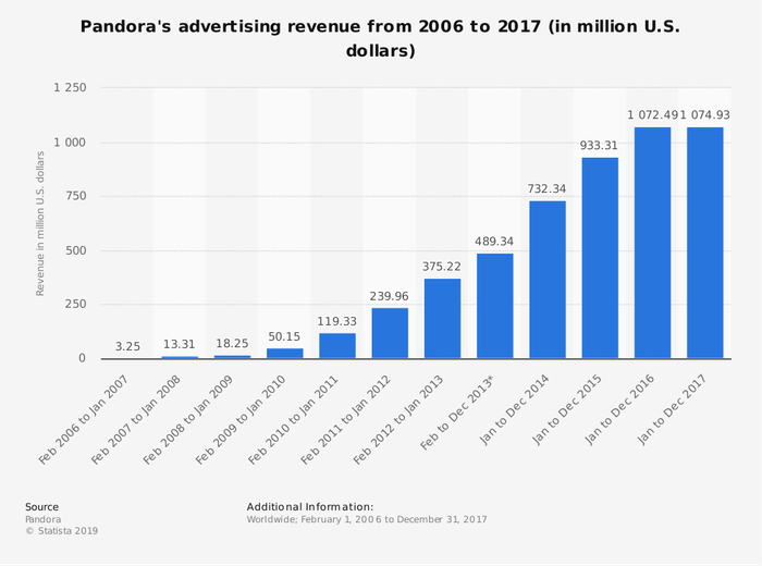 当时,Pandora公司价值高达70亿美元,拥有2亿用户,两年之内其整体用户数量就翻了一番,其中有7090万的月活用户。同年,Spotify仅拥有2400万月活用户,估值为40亿美元。