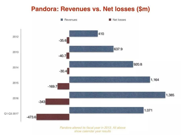 可惜好景不长,上市后的Pandora仿佛开启了“疯狂亏损模式”,财报惨不忍睹,被高盛分析师吐槽“遇人不淑,痴心错付”。