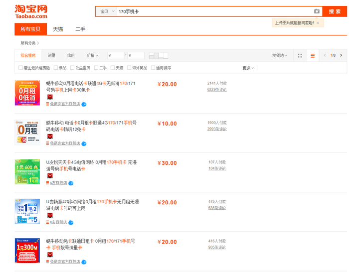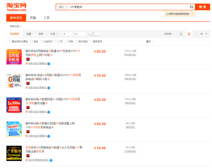在销售渠道方面,蜗牛通信业务也有一定优势。《科创板日报》记者通过淘宝搜索虚拟运营商号段手机卡发现,170、171号段蜗牛移动的排名较为靠前,手机卡销量也有一定规模。