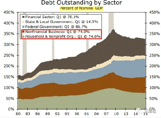 与此同时,美国企业部门的债务规模却在快速扩张,整体杠杆率已经攀升至74%。