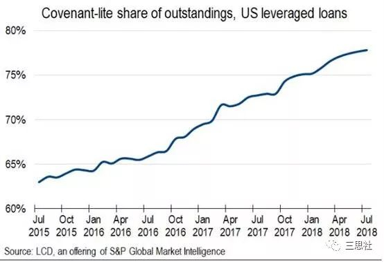 另一方面,杠杆贷款的投资者保护条款已大幅减弱。低门槛(Covenant-lite)贷款现已占市场存量的80%,创历史新高。