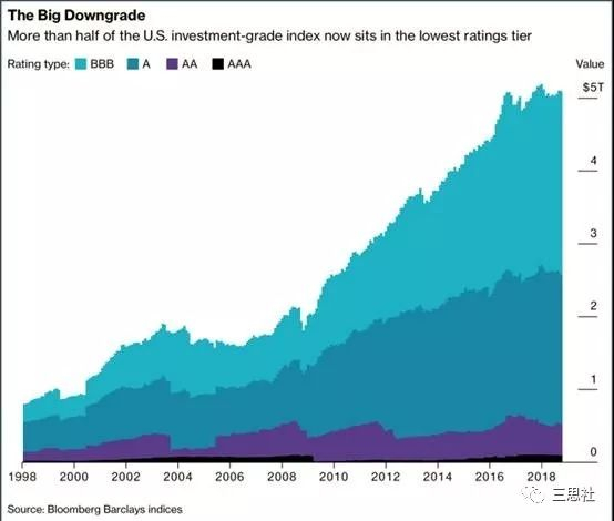 投资级债券中,评级最低的BBB级债券占比过半,而BBB级债券距离垃圾债只差两个评级。