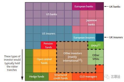 目前,全球50%以上的杠杆贷款由担保贷款凭证(CLO)持有。CLO将这些贷款重组打包,并分割成许多不同“层级”(tranches)产品,再出售给不同偏好的投资者。