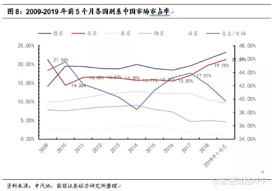 日系品牌市占率从2010年开始小幅复苏,2017年日系品牌经过产品力革新后市占率开始显著提升,从2016年的15.55%提升至2019年5月的21.27%。
