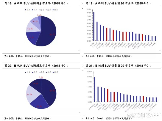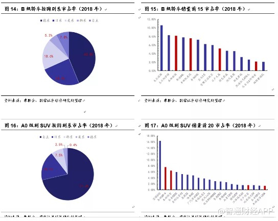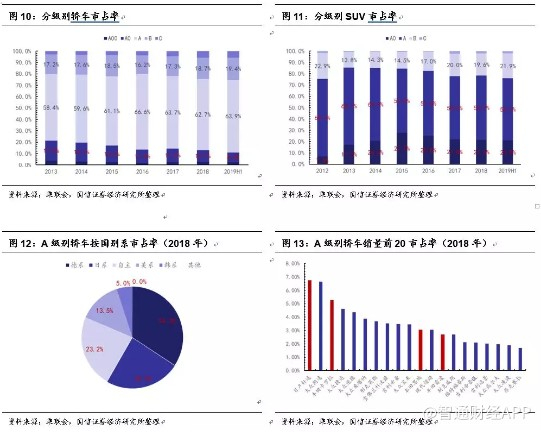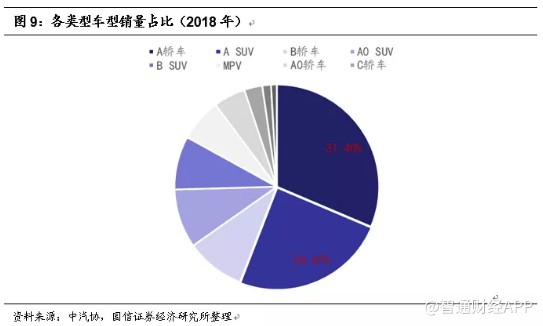 紧凑型轿车(A级)与中型轿车(B级)、小型SUV(A0级)、紧凑型SUV(A级)与中型SUV(B级)的市场份额整体相对较高,尤其是紧凑型轿车与紧凑型SUV。从2018年销量数据来看,紧凑型轿车销量占比达到31.40%,紧凑型SUV销量占比达到24.47%,两者达到约56%,因此对于整车厂而言,紧凑型轿车与紧凑SUV是兵家必争之地。