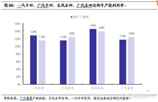 第三,广汽丰田在2018年产能由38万扩建至48万,但产能利用率从116%持续提升至125%,说明其对扩产进度与车型投放进度的把握能力很强。