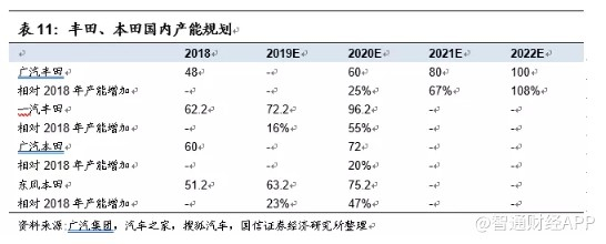 广汽丰田:2018年开启扩产能周期,24万/年传统车产能+40万/年新能源汽车产能,预计2020年产能达到60万/年,相对2018年产能提升25%,预计2022年产能达到100万/年,相对2018年产能提升108%