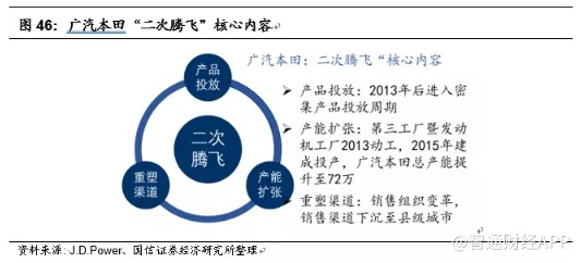 广汽本田于2013年提出“二次腾飞”,涉及产品、产能以及生产三个方面。产品层面,本田同样在华大力补充产品线,广汽本田在2013年引入新理念S1、凌派(专为中国市场打造的A级轿车)、第九代雅阁,在2015年推出全新锋范、新款凌派。产能层面,为配合新车型导入,广汽本田第三工厂暨发动机工厂提前于2013年5月动工,相对原计划提前约一年至2014年投产,一期产能12万/年,二期产能扩大到24万/年,最终将总产能提升至72万/年,一改广汽本田产能不足窘困。渠道层面,广汽本田对销售的组织机构进行变革,成立业务支援部,负责对全国六大商务中心进行直接管理,加强本部和商务中心的互动以强化终端执行力。同时进行销售渠道下沉至县级城市,并启动“二网”建设,让现有经销商在临近100公里的范围内建卫星店。