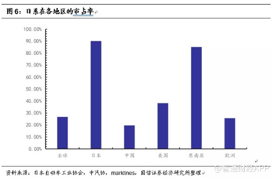 1980年日系轿车年产量达到1100万辆,相对1965年出口10万辆提升了110倍,超过美国成为世界汽车生产第一,也是美国和欧洲之后世界第三个汽车工业发展中心。2018年日系全球市占率达到27%,东南亚地区市占率超过85%,北美市占率达到38%,欧洲市占率达到26%,中国市占率达到20%。