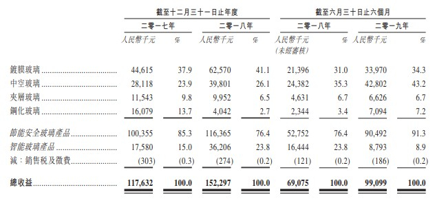该企业所得收益来自节能安全玻璃产品(包括镀膜玻璃、中空玻璃、夹层玻璃及钢化玻璃)及智能玻璃产品的销售。截至2017年及2018年12月31日止年度以及截至2018年及2019年前6个月,收益分别为人民币1.18亿元、人民币1.523亿元、人民币6910万元及人民币9910万元。