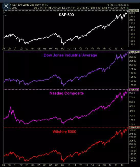 根据高盛统计数据,从2009年6月美股见底到2019年11月底,美股经历了史上最长牛市(最大回撤不超过20%),在这轮牛市里,标普500指数、道琼斯、纳斯达克以及威尔逊5000指数全部创下历史新高