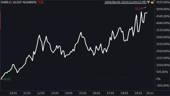 排名第三的是Sleep Number, 涨幅接近200倍,成立于1987年,公司设计、制造以及销售床、床垫、枕头以及其他与睡眠相关的产品,力图通过睡眠方式个性化来改善消费者的生活。