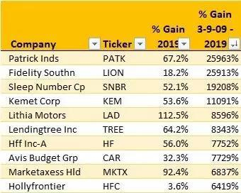 排名第一的Patrick Industries涨幅高达250多倍,公司成立于1959年,是组件产品制造商和分销商,还是一家生产建筑产品和材料休闲车和住房工业生产的公司。此外,该公司还是一家若干其他工业市场的供应商,如橱柜,家具,灯具零售及商业家具,船舶,以及其他工业产品。