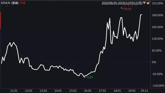 排名第四的Kemet Corp涨幅也高达110倍,是一家美国电容器制造商,例如钽、铝、多层陶瓷、薄膜、纸张、聚合物电解和超级电容器。Kemet还生产其他各种无源电子元件,如交流线路滤波器、EMI磁芯和滤波器、挠性抑制器、机电设备(继电器)、金属复合电感器、铁氧体产品以及变压器/磁性器件。