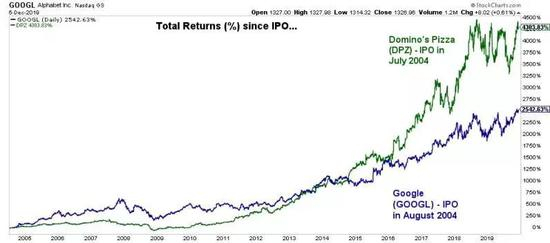 热闹的不一定是涨的最好,同样在2004年IPO的两家公司,谷歌是媒体头条常客,达美乐披萨相对更低调,但是二者的涨幅整整差了20倍,达美乐上市以来翻了43倍,谷歌涨幅只有25倍。